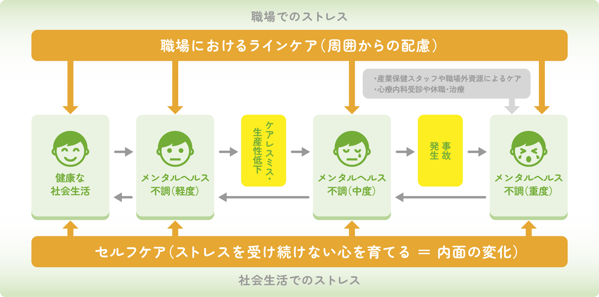 重症化して受診・休職などを余儀なくされる前に、企業が日常的に「セルフケア」「ラインケア」を提供・整備することで、軽度の不調からの回復や、不調の未然予防・再発防止につながることが期待されます。